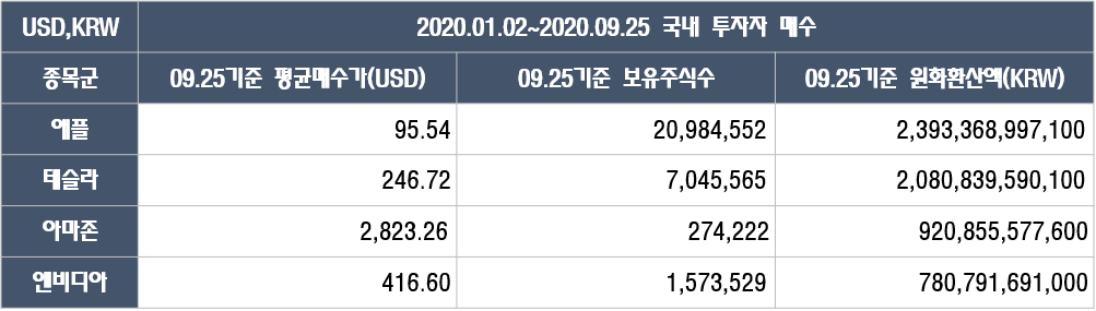 9.25일자로 달러원 환율과 각 회사의 평균 주가를 토대로 매수시점 가정치를 두고. 국내투자자들의 평균매수 주식가격과 보유주식수 원화 환산액을 도출하였습니다.