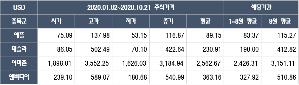 대부분 저가는 3.18~20일 코로나 이슈로 달러원 환율이 1300원에 육박했던 시기에 각 사의 주가는 저가를 형성했고, 고가는 미 연준의 대규모 부양책과 유동성으로 지속적인 상승세를 보이며 9.1~2일에 고점을 형성하였습니다. 이후 9월 한달 고점대비 10~20%가량 하락하였으나 서서히 회복하고 있는 상황입니다.