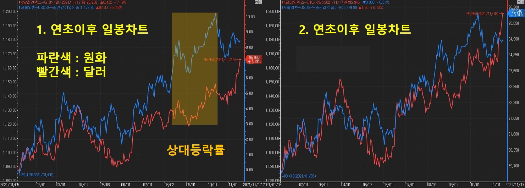 최근 달러인덱스가 고점을 경신하고 있지만 원화는 그만큼 못쫒아 가는 것으로 보여지는데요. 아래 그림 1번에서 보시는 것처럼. 연초이후 10월까지 달러강세가 5%진행된 상황하에 원화는10%가량 약세로 크게 반응하였던 부분에 대한 갭이 메워지고 있는 것으로 생각됩니다. 현재 연초이후 달러강세는 7.19% 진행되었으며 원화 1185원은 9% 수준으로 보여집니다.