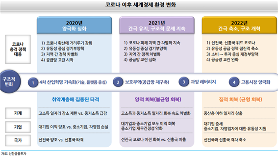 2021년 세계경제는 코로나 충격에서 일부 벗어나 양적 회복에 성공했으나 불균형한 회복 지속. 코로나 확산에 따른 차별적 대응과 공급망 충격에 타격. 2022년에는 선진국, 신흥국 모두 위드 코로나(With Corona)에 나서며 경제 정상화 가속화 기대. 원자재, 재화 생산, 물류, 재고, 고용 등 경제 전반에 광범위하게 퍼진 공급 병목은 정점을 통과해 2022년 상반기 중 정상화 예상