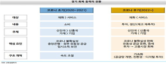 코로나 불확실성이 완화되며 비대면 소비가 가능했던 재화(제조업)에서 서비스로 경기회복 동력 이동 할 전망. 유동성정책의 점진적 축소 속에 고용정상화 속도조절로 소비 모멘텀은 약화. 대신 생산정상화에 따른 재고 재축적, 투자확대가 경기 우상향 흐름을 지지. 재고순환에 따른 단기 사이클은 정점부근에 위치. 소비의 정점에도 재고확충에 정점부근 등락예상. 공급망 개편, 신기술투자, 정부 투자확대 등 선진국 주도투자로 10년 주기의 중기사이클은 초입구간으로 판단. 1994~1995년, 2004~2005년, 2011~2012년과 유사한 경기사이클이며 당시 고성장, 고물가 흐름이 나타난점을 감안시 금번에도 이를 재연