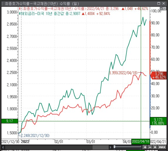 다음달 FOMC는 5월 5일로 2주일이 채 남지 않았습니다. 한국은 4월달도 25bp 선제적인 금리인상을 하며 대응에 나섰으나 전일기준 미10년물 국채금리가 2.91%, 한국 10년물 국채금리가 3.31%로 40bp밖에 차이가 나지 않는 상황으로 연초부터 한국10년물 국채금리는 46%상승한데 반해 미10년물 국채금리는 92%상승하며 선반영하고 있어 자금유출 우려도 있어보입니다.