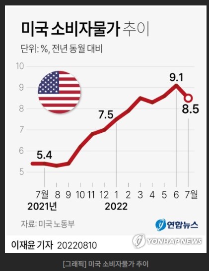 7월 CPI지수는 전년동월보다 8.5%상승하며 40년내 최대치였던 전월 9.1%보다 둔화되었고 시장예상치인 8.7%보다 낮은수치로 발표되며 9시30분 발표직후 달러인덱스는 106pt에서 104.5pt까지 1%이상 급락하였고, 미증시선물지수는 +2.5%대로 급등하는 모습을 보여줬습니다. 유가가 배럴당 120불에서 90불로 안정된 흐름에 물가 급등세가 정점을 찍은 것으로 보여집니다. 변동성이 큰 에너지, 식품을 제외한 코어CPI도 전년동월보다 5.9%로 시장예상치인 6.1%를 하회하는 수준으로 발표되었습니다.