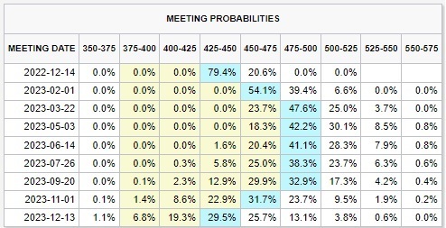 전일 CPI 발표 후 CME페드워치에 따르면 미연준의 내년 최종금리가 5%에 마무리 될 확률이 더 커진것으로 보여집니다. 12월FOMC에서 50bp, 2월 25bp, 3월 25bp로 금리인상이 종료될 것이란 기대감이 형성되고 있습니다.