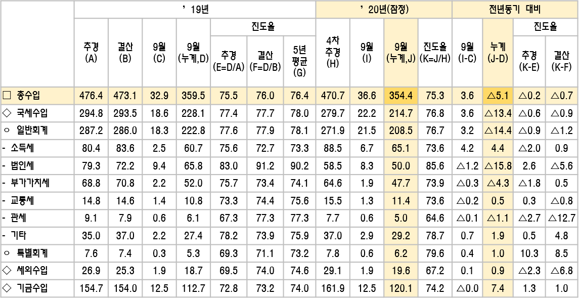 2020년 1월~9월까지 재정수입은 354.4조원(전년대비 -5.1조원)인데 지출은 434.8조원(전년대비 +48.8조원)