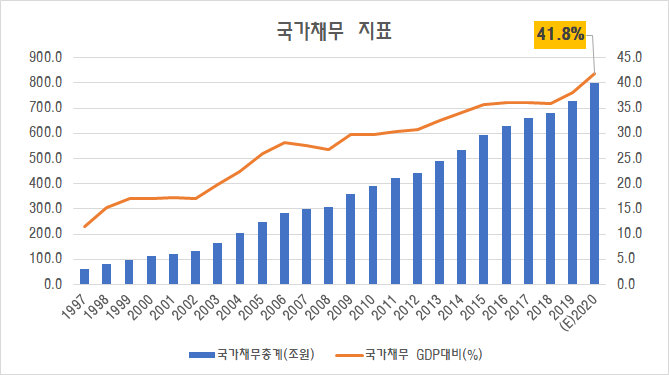 내년이 되면 국가채무는 GDP대비 41.8%수준이 될 것으로 보이며 국가채무총계는 800조원을 돌파할 것으로 예측됩니다. 20년 전부터 전체GDP가 증가하며 국가채무는 어느 정권이나 역대급, 사상최대치라는 점이 눈에 띕니다.