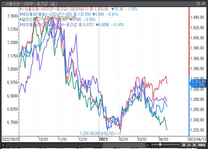 다만, 4월 계절적 요인이 외국인배당금 역송금 수요와 무역수지적자지속은 하락속도를 제한할 것으로 보여집니다. 금일 1300원 하향이탈을 시도할 것으로 보이나 전일대비 -30원. 2%넘는 급락을 보인 영향에 반발매수세가 유입될 가능성도 있어보여 금일 1300원대 지지여부를 확인해야할 것으로 보여집니다.