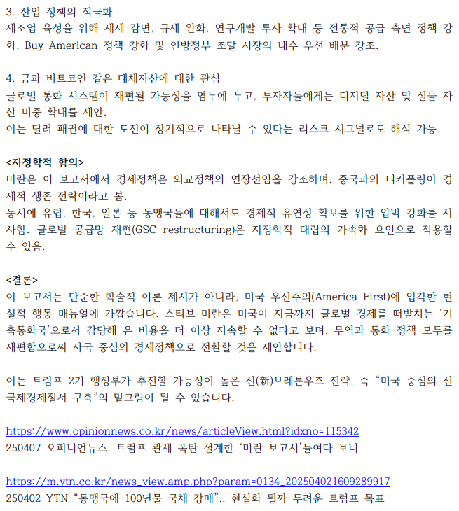 아래는 트럼프의 관세지침이 되었던 24.11월 발표한 백악관경제자문위원 스티브미란의 41페이지 보고서를 요약한 내용입니다. 저 보고서대로 점진적인 관세정책을 진행했다면 현재와 같은 금융혼란은 없었을 것으로 보이나 강경파의 주문대로 발표되어 금융위기 전단계까지 갔다 온 것 같습니다. 아래 자료는 요약본이며 원문 필요하시면 요청해주시면 전달드리겠습니다.