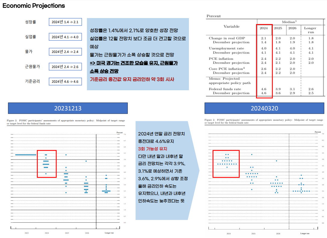 금일 새벽 발표된 FOMC에서는 금리를 동결했습니다. FOMC 전 1,2월 물가가 예상치를 상회하면서 연준에서 금리인하 횟수를 기존 3회에서 2회로 낮출 가능성에 달러원 환율은 상승하기도 했으나, 점도표에서는 기존 3회 인하 경로를 유지했습니다. 이에 6월금리인하 가능성이 급등했습니다.