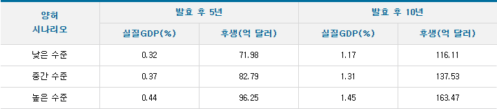 후생은 단기적(5년) 약 89.21~138.56억불, 중기적(10년) 약 113.51~194.56억불 증가 분석