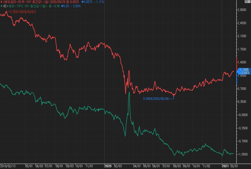 다만, 미국의 인플레이션 우려에도 불구하고 TIPS물가채 금리가 같이 오르는 점 (TIPS 실질금리 = 명목금리 - BEI기대인플레이션) 즉, 실질금리가 상승하는 것은 채권시장에서 인플레이션에 대해 회의적으로 보고 있다고 생각해볼 수 있어보입니다. 이에 시간을 두고 인플레이션 우려는 완화될 것으로 예상되며 연준도 이를 시장참가자들에게 지속적으로 전달하고 있는 것으로 보입니다.