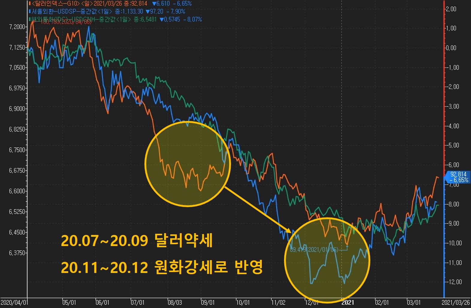 상기 그림파일은 20.4월이후 달러, 위안화, 원화의 차트입니다. 지난해 7월~9월 달러약세를 원화는 뒤늦은 11~12월에 원화강세로 전부 반영하였으며 연초이후 각각 5%가량 상승하며 같은 움직임을 보이고 있습니다. 다만, 그 달러강세부분을 최근 원화는 조금 더디게 따라가고 있는 것으로 보여지네요.