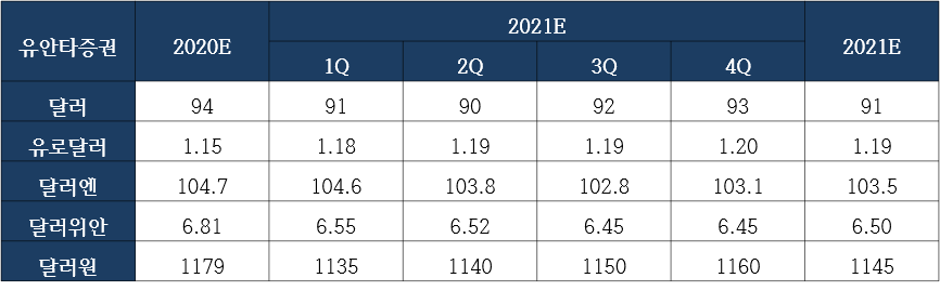 달러약세, 원화강세를 예상했던 가장 큰 이슈였던 미 대규모부양책으로 인한 달러유동성 증가가 유럽대비 양호한 경기회복과 채권가격하락을 동반한 국채금리상승으로 인플레이션 우려가 커져 예상과는 다른 달러강세를 보이고 있는 것으로 판단됩니다.