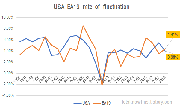 2008년 글로벌 금융위기때 GDP증가율이 -2%가량으로 하락한 이후 줄곧 2~4%대의 성장세를 지속해왔고. 유로존보다는 미국의 성장세가 상당히 안정적이였던 것으로 판단됩니다.