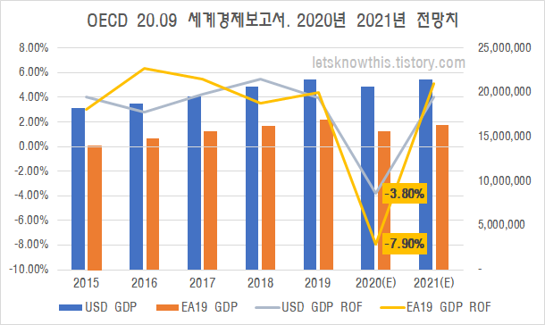 상기 차트는 2020년 9월에 발표한 OECD 세계경제전망보고서에서 발췌하여 유로존과 미국의 예상성장률을 넣어 만든 차트입니다. 유로존은 올해 -7.9%의 하락과 미국은 -3.8%로 경제규모가 감소할 것으로 예측하였으며.