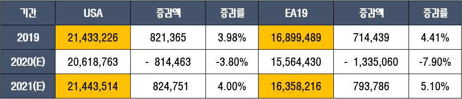 미국은 2020년 -3.8% 마이너스 성장률을 기록하지만 2021년 다시 2019년 수준으로 회복가능.