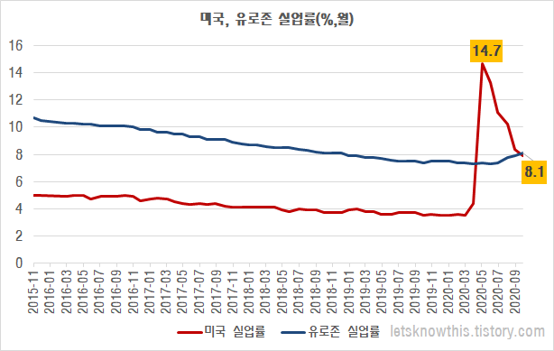 유로존 실업률은 2015년 10%대에서 지속적으로 하락하여 최근 3년간 8%대를 유지하였고 이번 코로나로 인한 경제봉쇄에도 불구하고 큰 폭의 실업률 증가세를 보이지는 않았습니다.