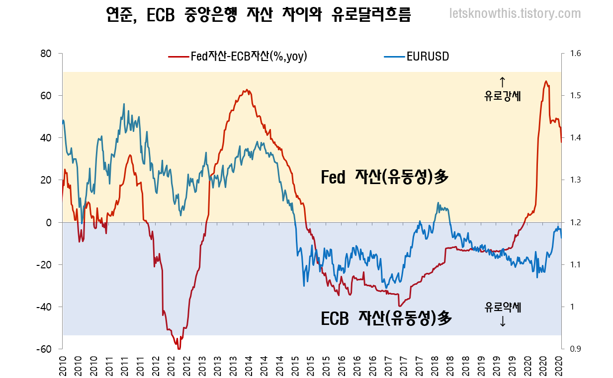 가장 기본적인 "통화량이 많은 통화는 가치가 하락한다."를 연준과 ECB의 자산비교를 통해 유로달러 흐름을 체크해볼 수 있도록 차트를 만들었습니다.