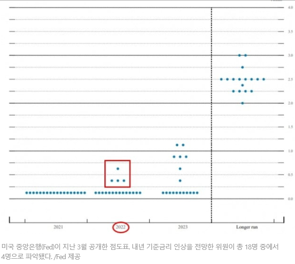 다만, 점도표는 주목할 필요가 있어보입니다. 점도표는 FOMC위원들의 금리전망(3년 예상)을 보여주는 지표입니다. 지난 3월엔 18명의 위원 중 4명이 2022년 금리인상 전망, 7명이 2023년 금리인상 전망하였습니다. 6월 FOMC에서 2022년 금리인상 점도표가 늘어날 경우 테이퍼링 논의가 올해 이뤄져야 할 것이기 때문입니다.